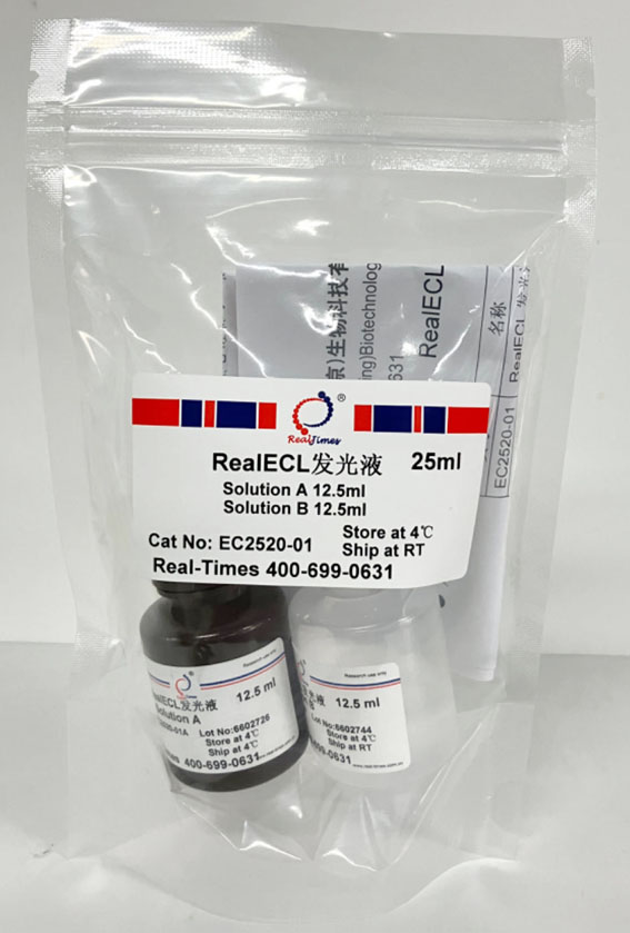 RealECL 是一種超敏ECL化學發光試劑盒,可與二抗上耦連的辣根過氧化物酶(HRP)發生化學反應,發出熒光,從而可以通過用X光片壓片或其它適當熒光成像設備檢測樣品。RealECL具有極高靈敏度和高信噪比,可檢測出10-100 fg的微量抗原;發光迅速,熒光可使X感光膠片感光達1小時以上,特別適用于痕量蛋白檢測;另外高靈敏度可以大大節省寶貴的樣品以及非常昂貴的一抗和二抗的用量,降低實驗成本。
