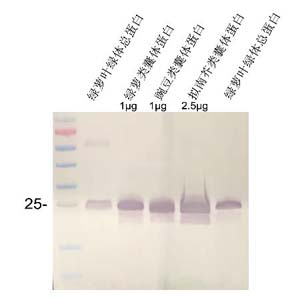 檢測到條帶,25 kD Electrophoresis: 12% RealPAGE SDS Electrophorosis(RTD6148) Transfer: 1×RealBlot transfer buffer(RT5020) 350mA blotting to NC membrane for 30min. Blocking: BSA at RT for 1h. Primary antibody: Lhca3 1:5000 dilution at RT for 1h Secondary antibody: 1:5000 dilution using Goat Anti-Rabbit IgG AP Detection: using BCIP/NBT at RT for 5 min